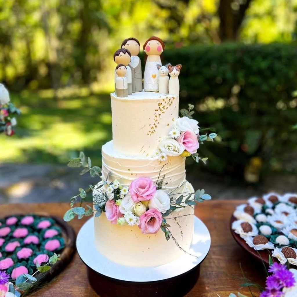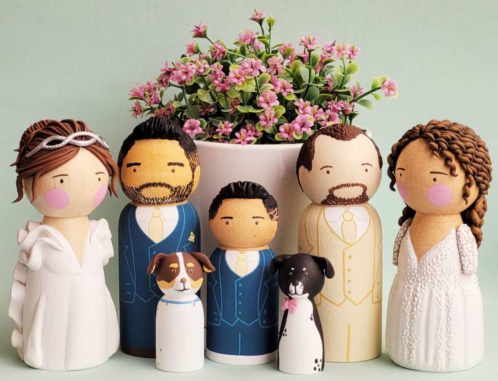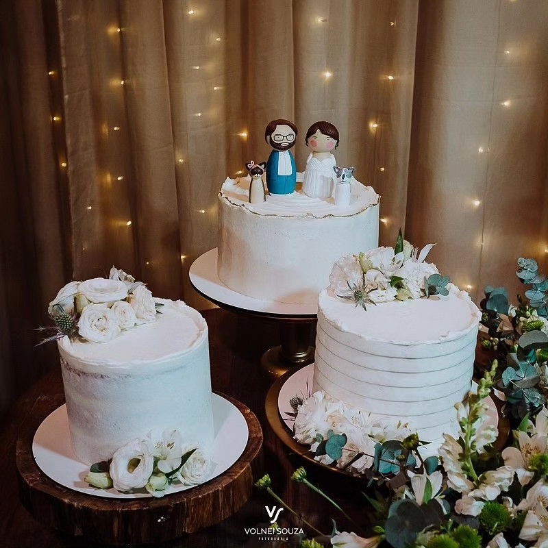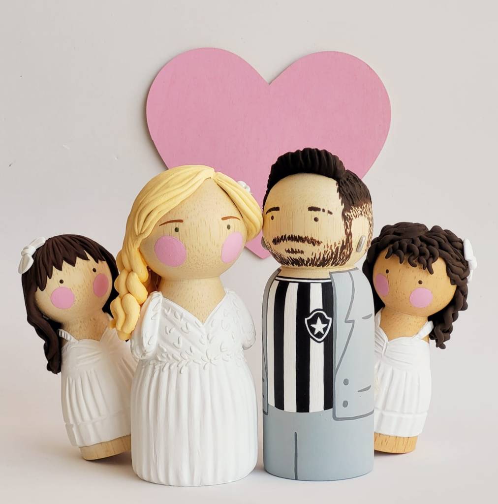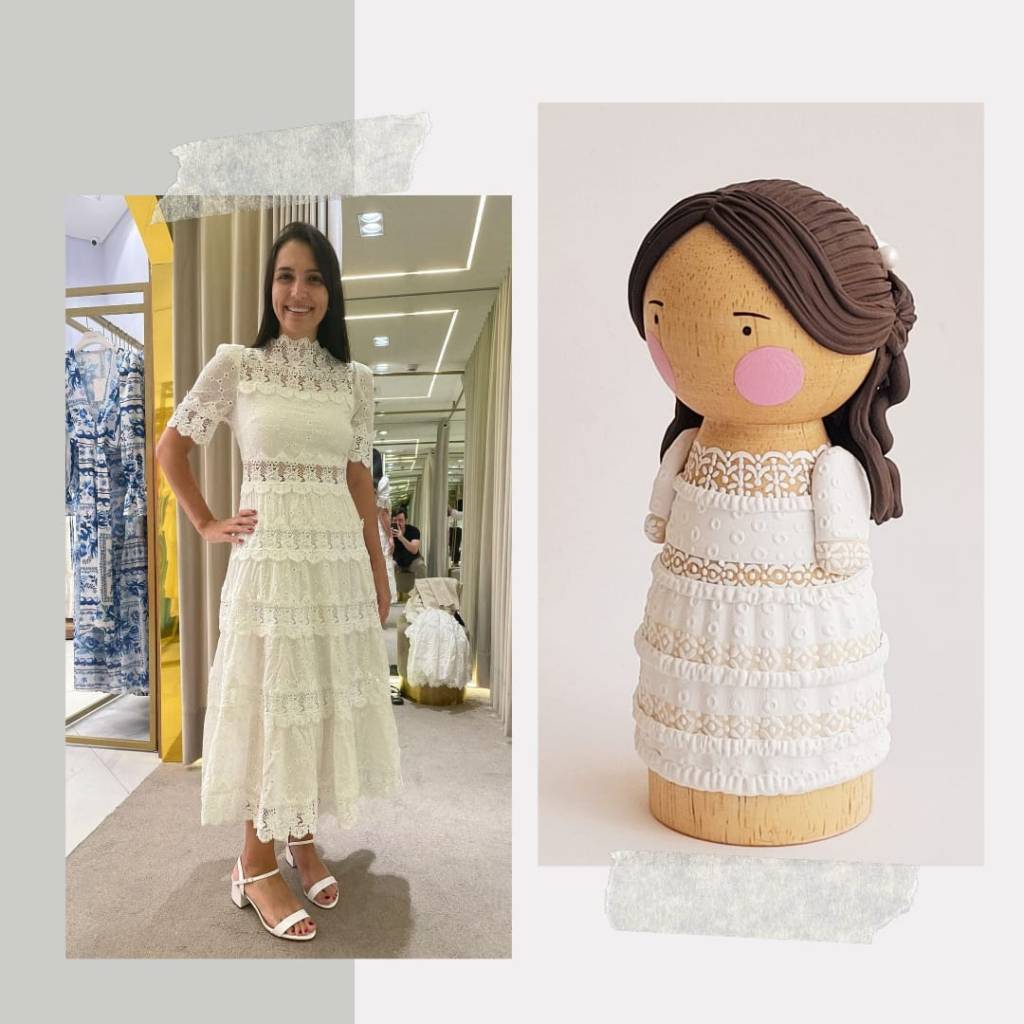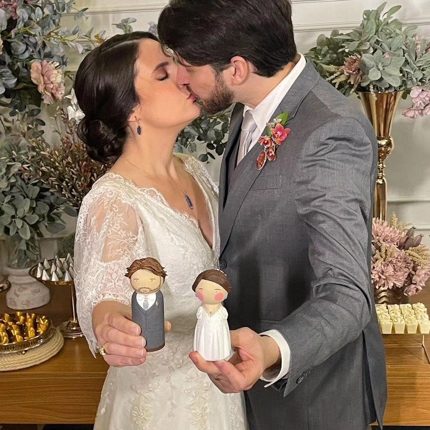 A partir de fotos, vídeos e referências das roupas e penteados dos noivos, reproduzo os detalhes nos bonequinhos. A ideia é ficar o mais parecido possível com os noivos, criando uma experiência exclusiva para o topo de bolo do seu casamento.
