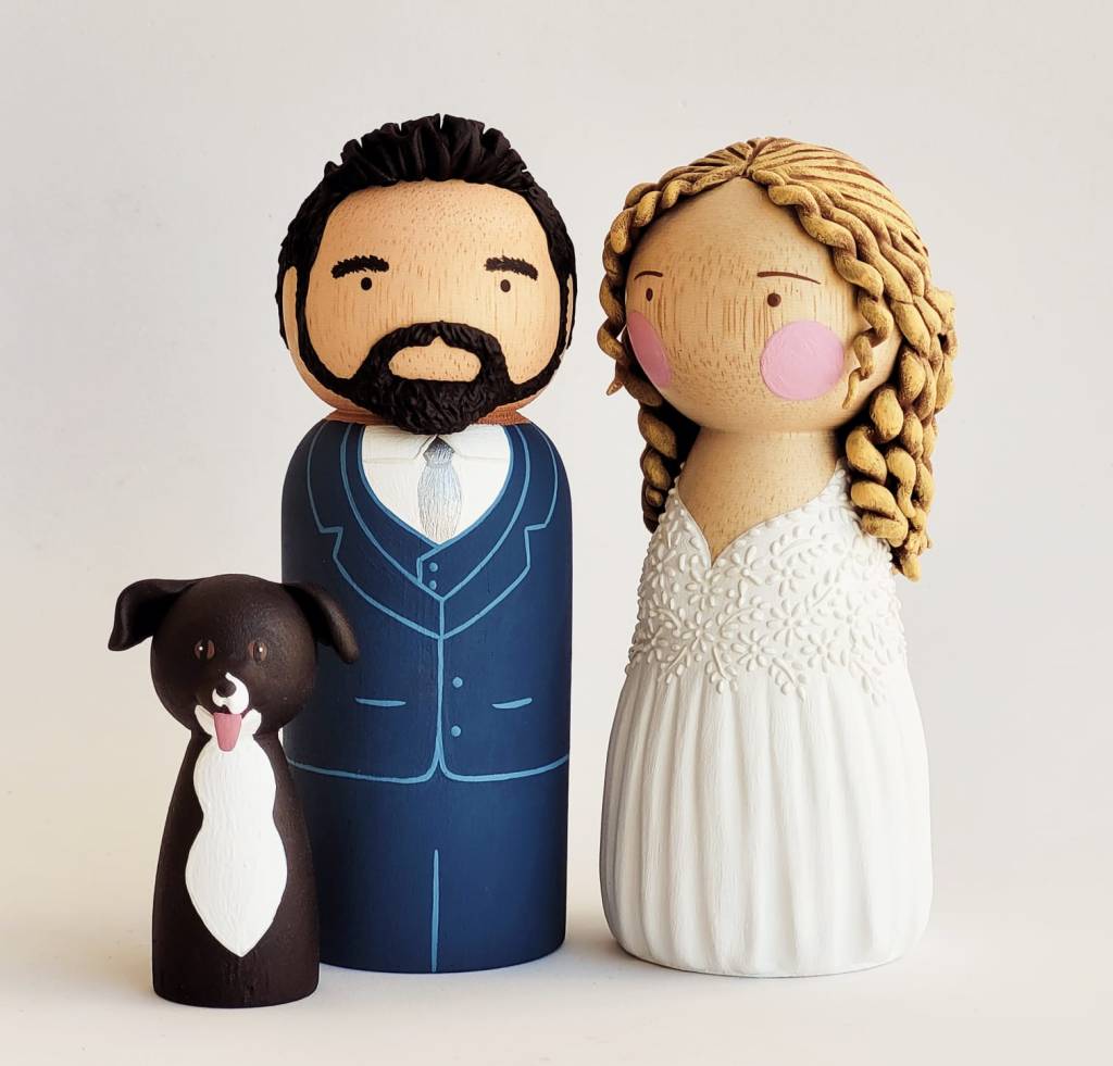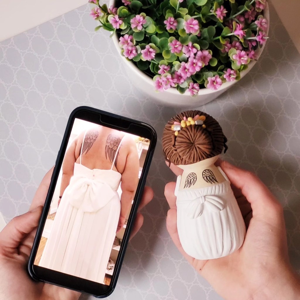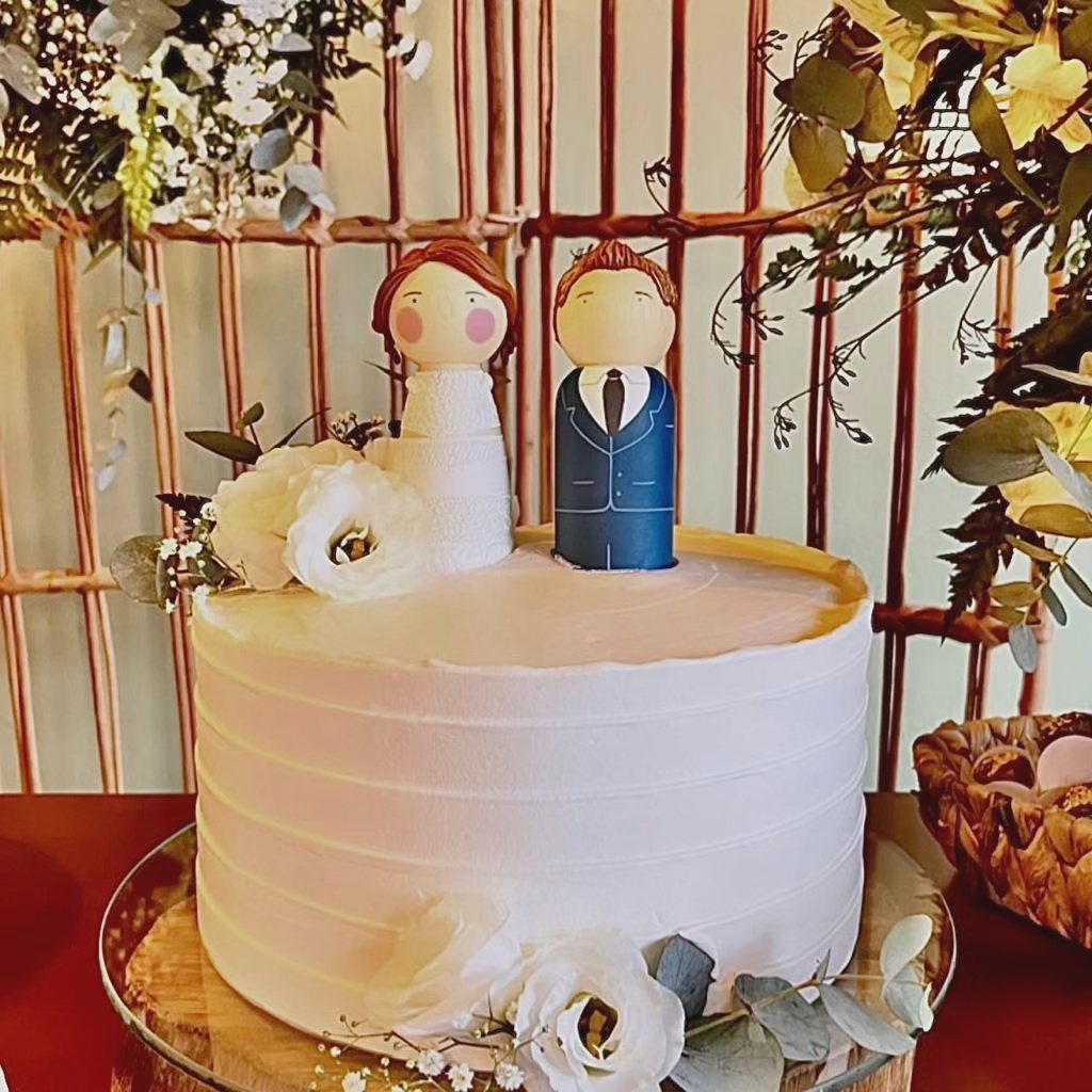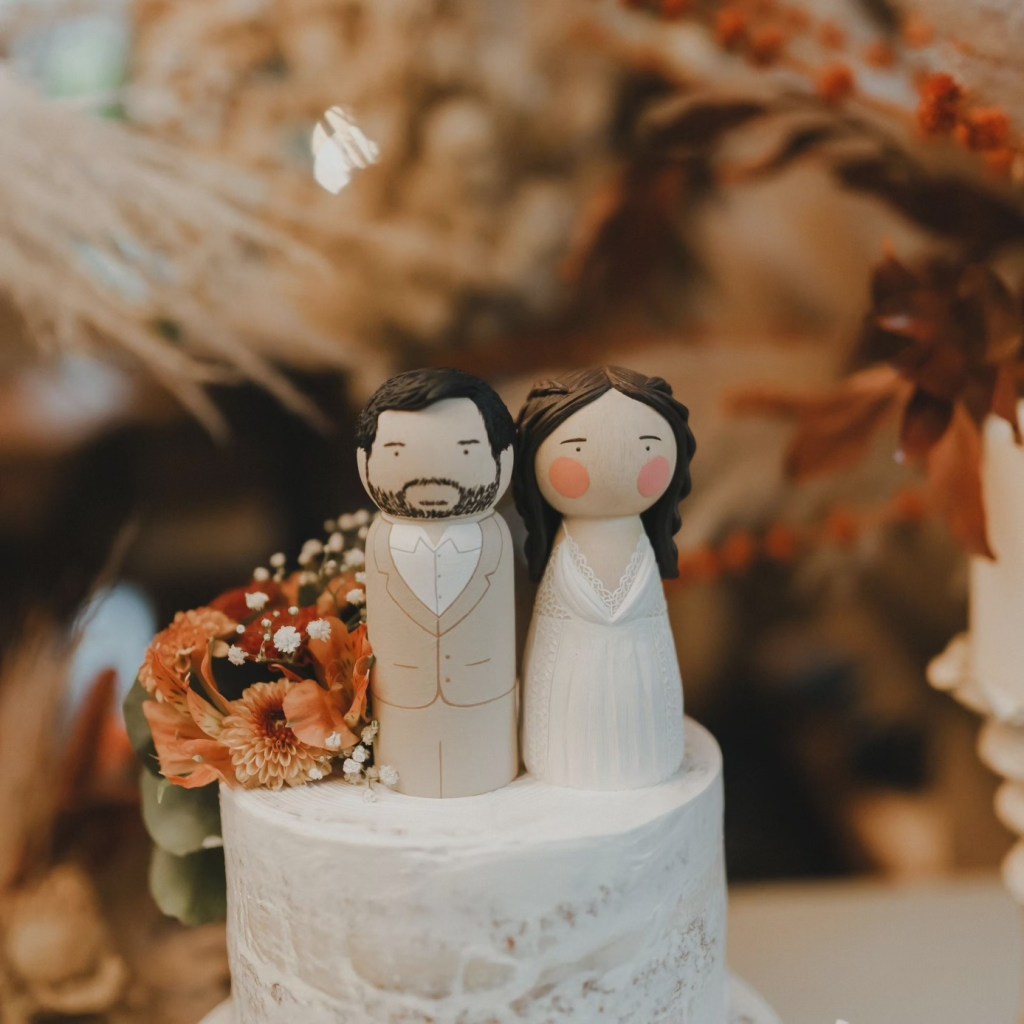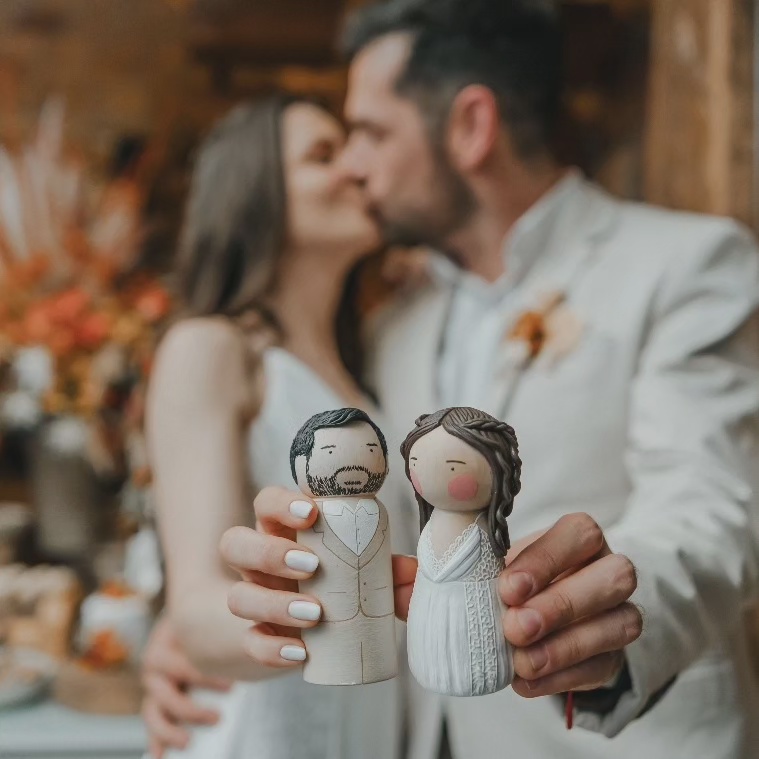 A partir de fotos, vídeos e referências das roupas e penteados dos noivos, reproduzo os detalhes nos bonequinhos. A ideia é ficar o mais parecido possível com os noivos, criando uma experiência exclusiva para o topo de bolo do seu casamento.