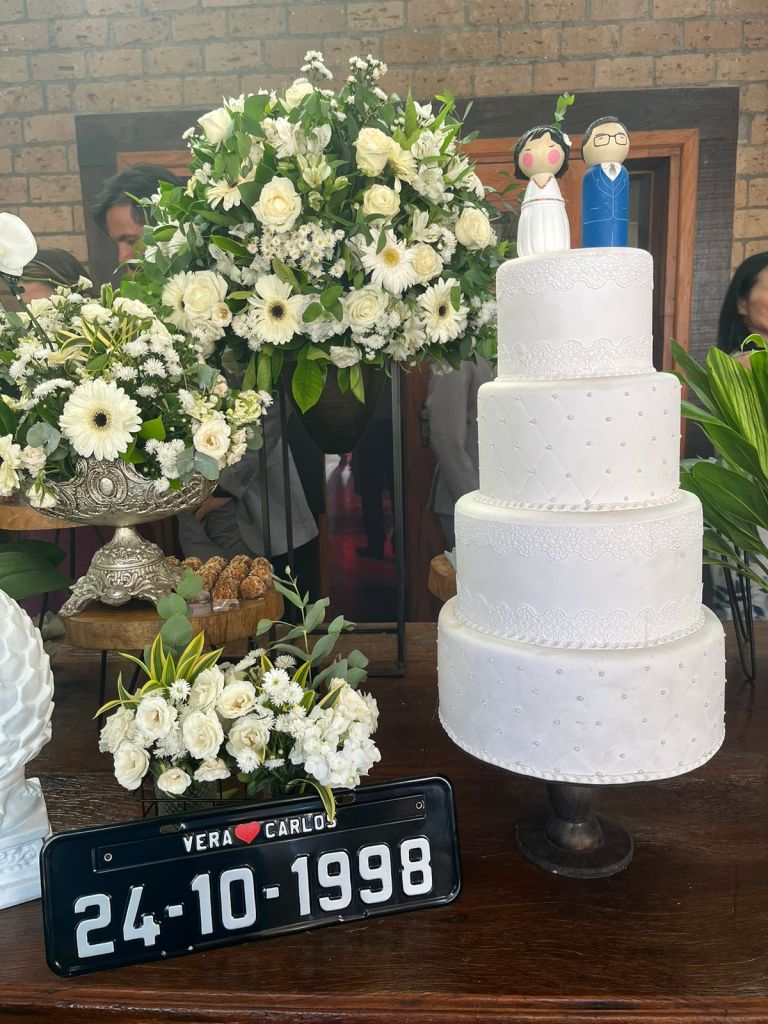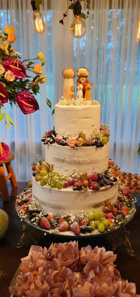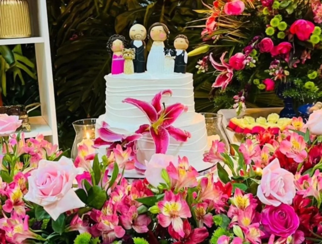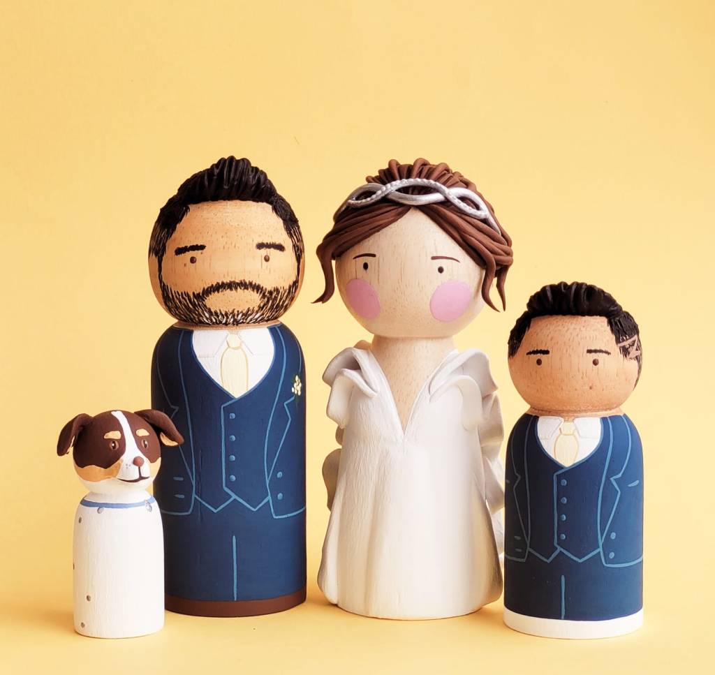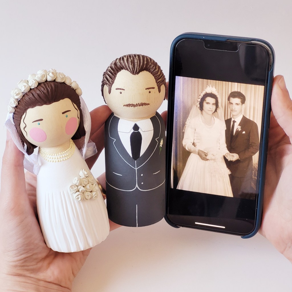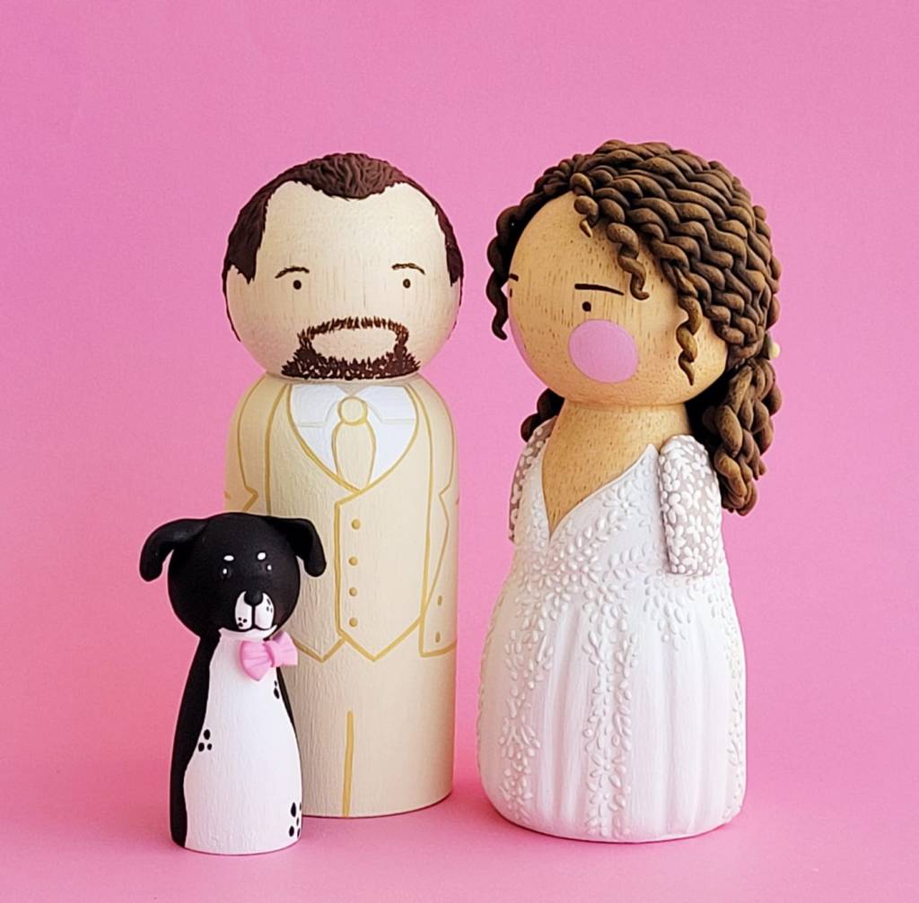 A partir de fotos, vídeos e referências das roupas e penteados dos noivos, reproduzo os detalhes nos bonequinhos. A ideia é ficar o mais parecido possível com os noivos, criando uma experiência exclusiva para o topo de bolo do seu casamento.