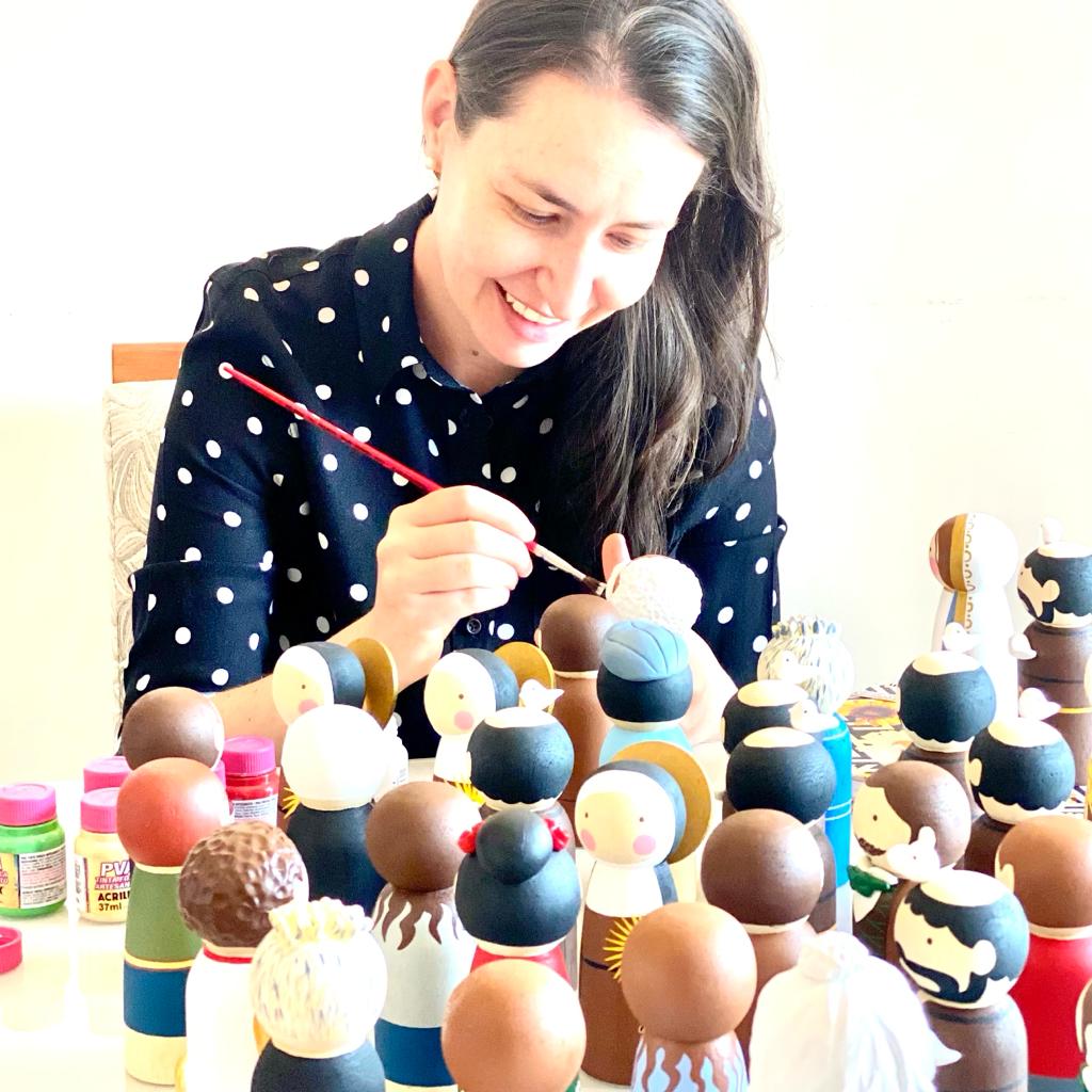 Prazer, eu sou a Juliana! Montei a “Coleção de Bonecos” no final de 2020, em plena pandemia. Na época, eu trabalhava como jornalista na TV Globo e precisava de uma atividade que me tirasse um pouco das telas. Usei o vale de Natal da firma para comprar os primeiros bonecos e comecei a pintar. Hoje, a pintura dos bonecos é minha principal atividade. Estudei Desenho Artístico na Escola Panamericana de Artes, em SP, e já entreguei mais de 10 mil bonecos no Brasil e no exterior.